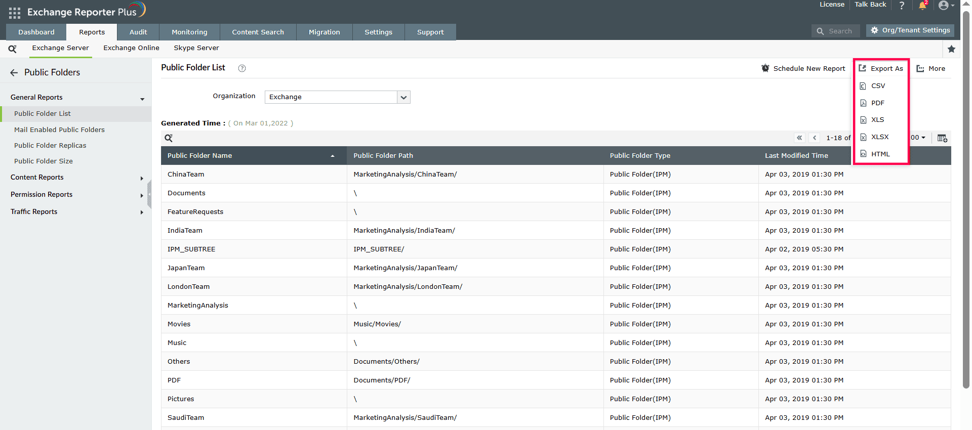 Exchange Reporter Plus, a reporting, auditing, monitoring, and content search tool offers four distinct categories of reports on public folders as shown in the image below. The tool offers content reports for public folders, and enables you to search for specific keywords in the body or subject. These and other tool features simplify the tedious tasks of managing public folders across various Exchange servers in your organization. You can generate public folder reports instantly, customize and filter the attributes that you need, and export these reports at the click of a button, without having to use PowerShell scripting. Exchange Reporter Plus also enables you to export reports in four formats: CSV, PDF, XLS, and HTML.