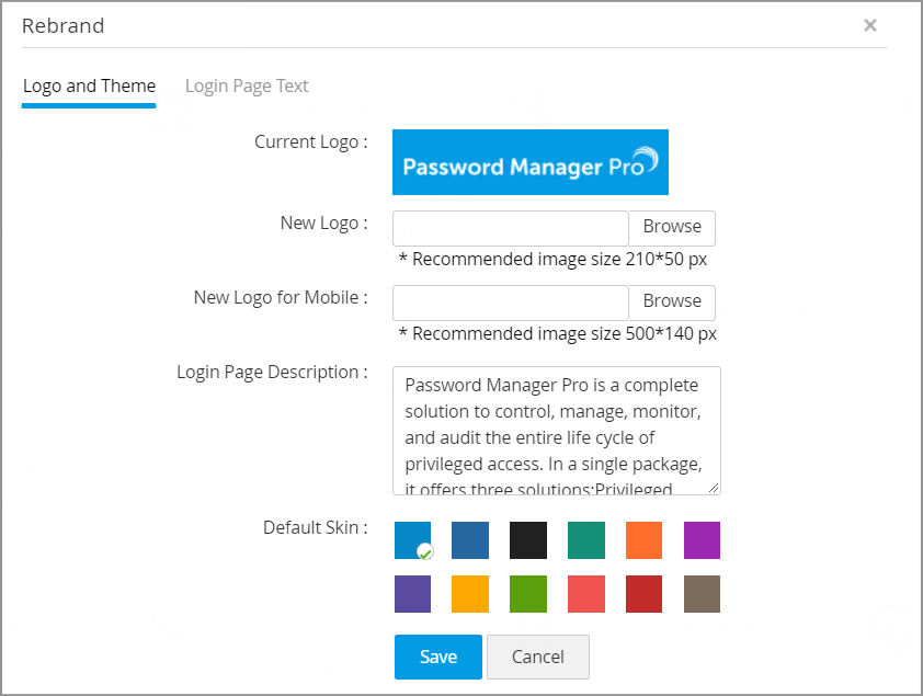 If you want to replace Password Manager Pro?s logo in the GUI with your company logo, you can do so with a simple setting change. The recommended logo size is 210 x 50 pixels. To effect the change, navigate to the Admin tab and click Rebrand under the Customize section.