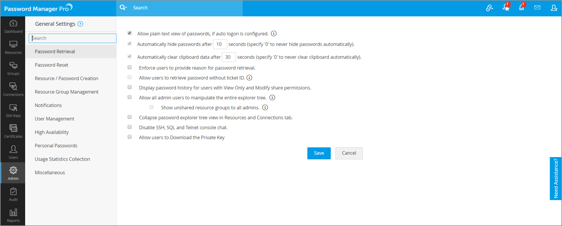 Password Manager Pro lets you selectively enable or disable various settings based on the specific needs of your organization. You can choose to enforce or disable various policies through these settings. Navigate to Admin > Settings > General Settings to customize your options.