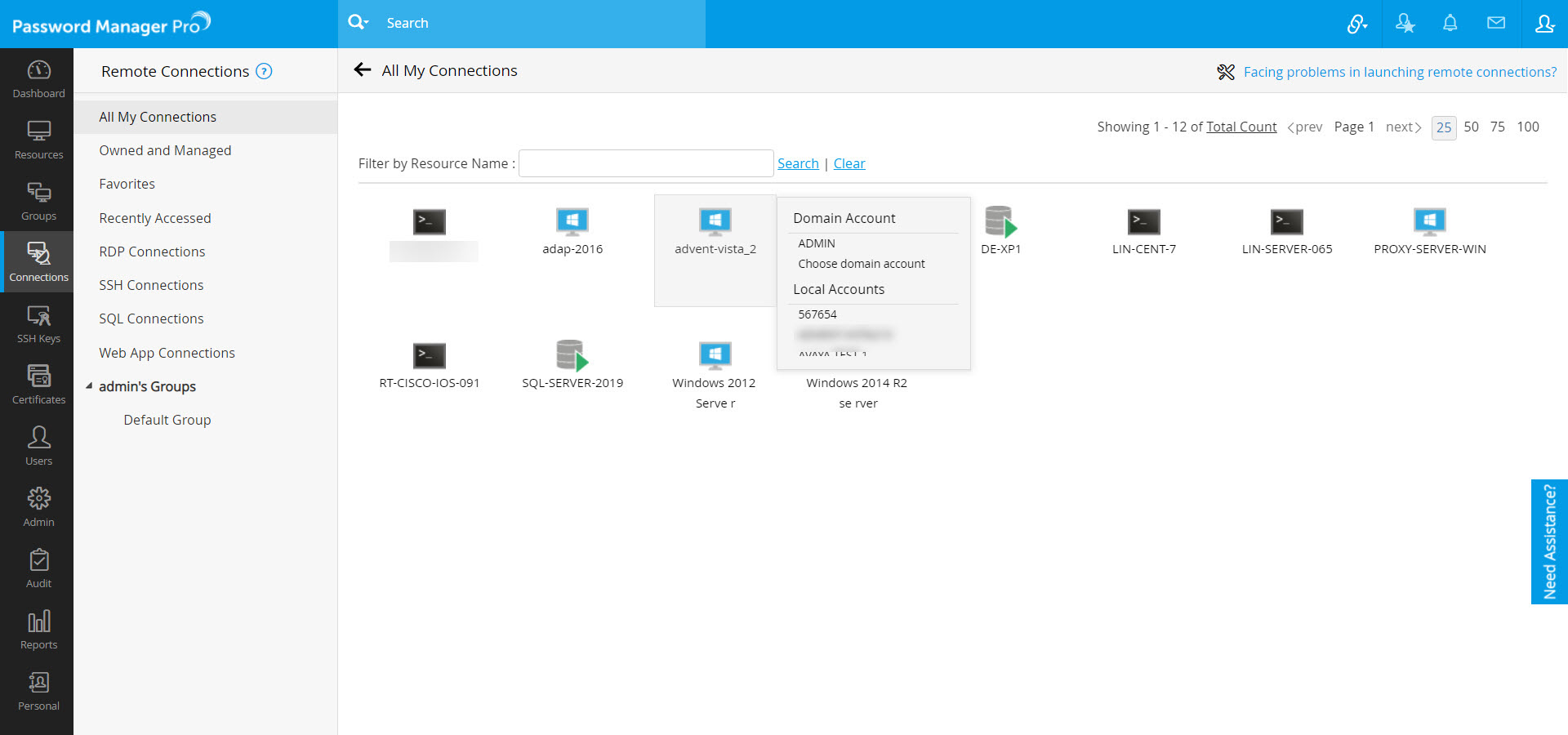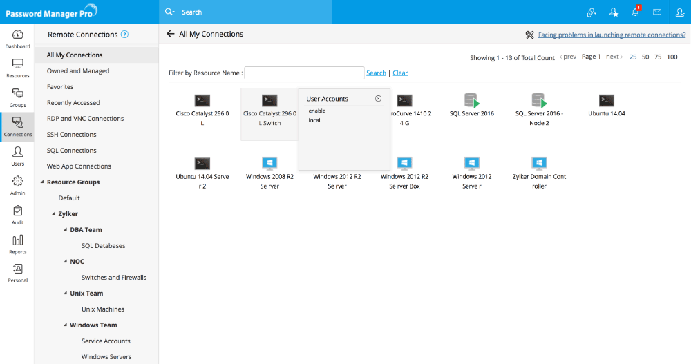 As soon as an administrator adds a resource that supports one of the three remote terminal session types (Windows RDP, SSH and SQL sessions), the feature becomes available to all users in the system who have access to that resource, with no further configuration anywhere. The Connections tab will allow users to easily locate remote accounts and launch a session with a single click.