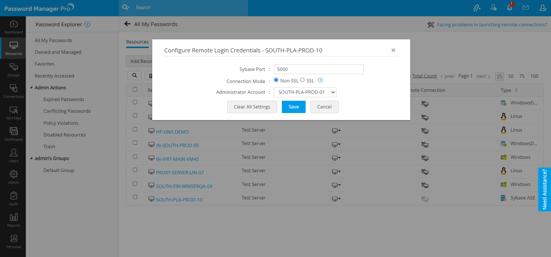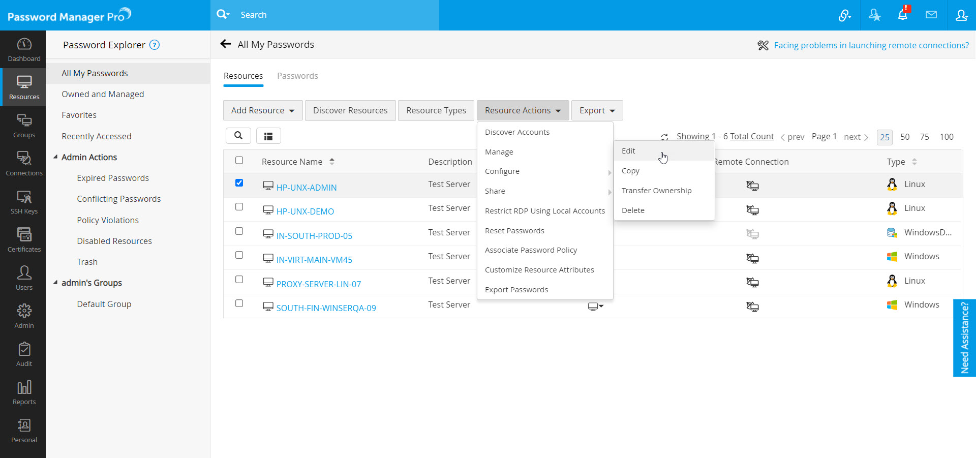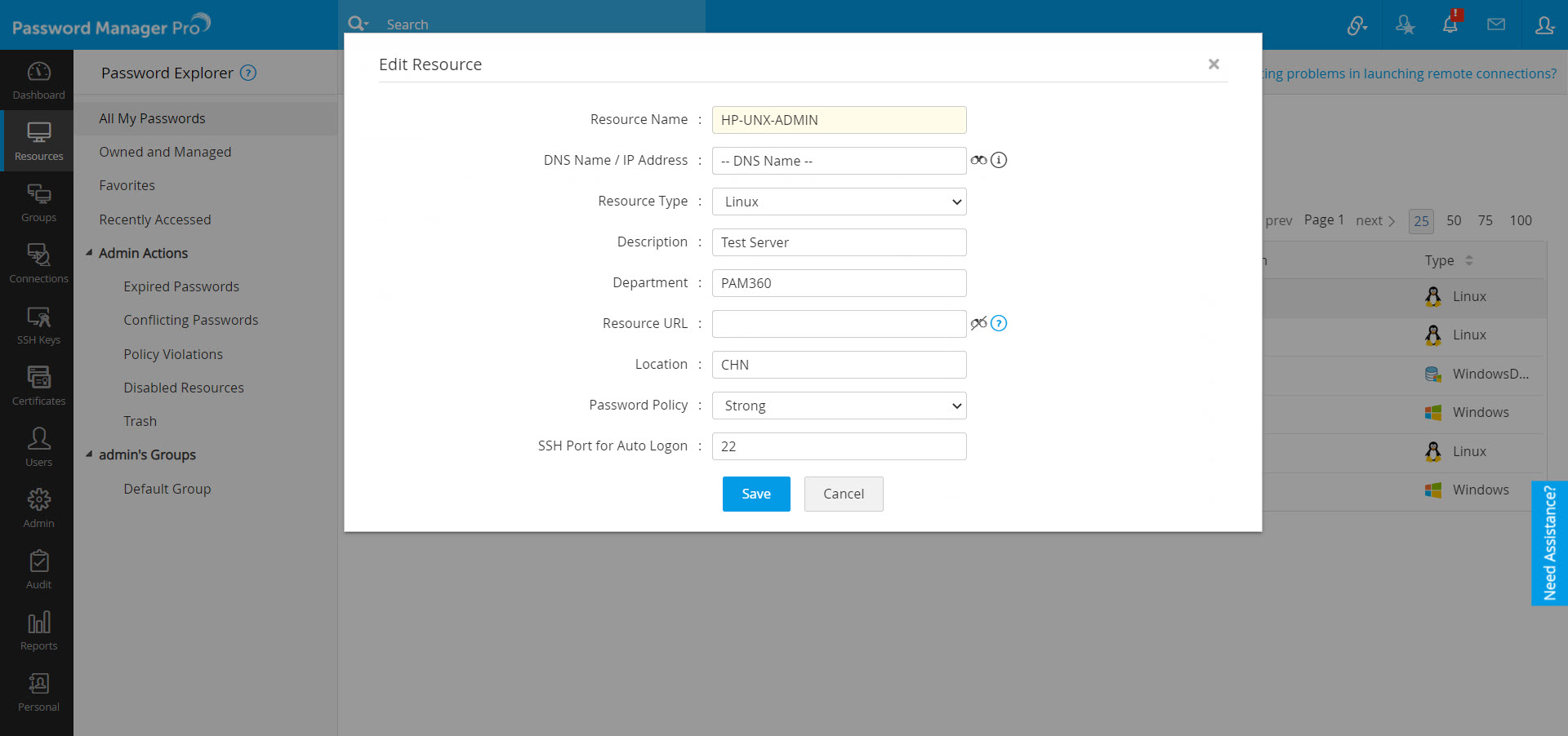 - You can configure the SSH port in which the SSH service is listening on the remote host. Password Manager Pro will use this port for launching the session. To do this, navigate to the Resources tab, select the desired resource(s), and choose Resource Actions >> Edit Resource from the drop-down beside the resource(s).