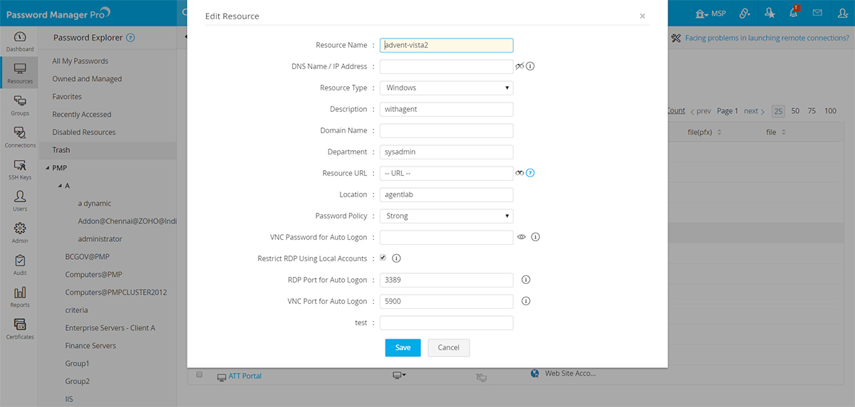 - In the Edit Resource window that opens, enter the RDP and VNC ports in the respective fields, and click Save.