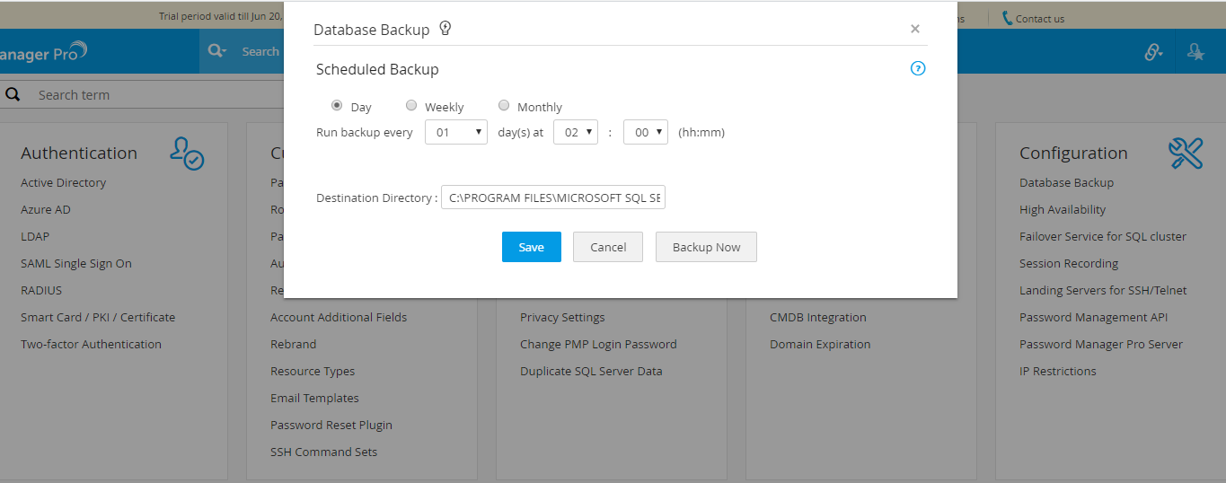 Data stored in Password Manager Pro database is of critical importance. In any production environment, there would be constant requirements for backing up the data, for either reference purpose or disaster recovery. You can schedule tasks to back up the database contents periodically. The backup will be stored as a .zip file by default in the host, where the SQL server is running. All the sensitive data will remain encrypted in that file.