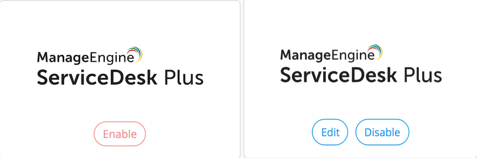 In the Integrations | ManageEngine page, you will see the ServiceDesk Plus block that looks like any of the below images based on whether you have disabled or enabled the integration, respectively: