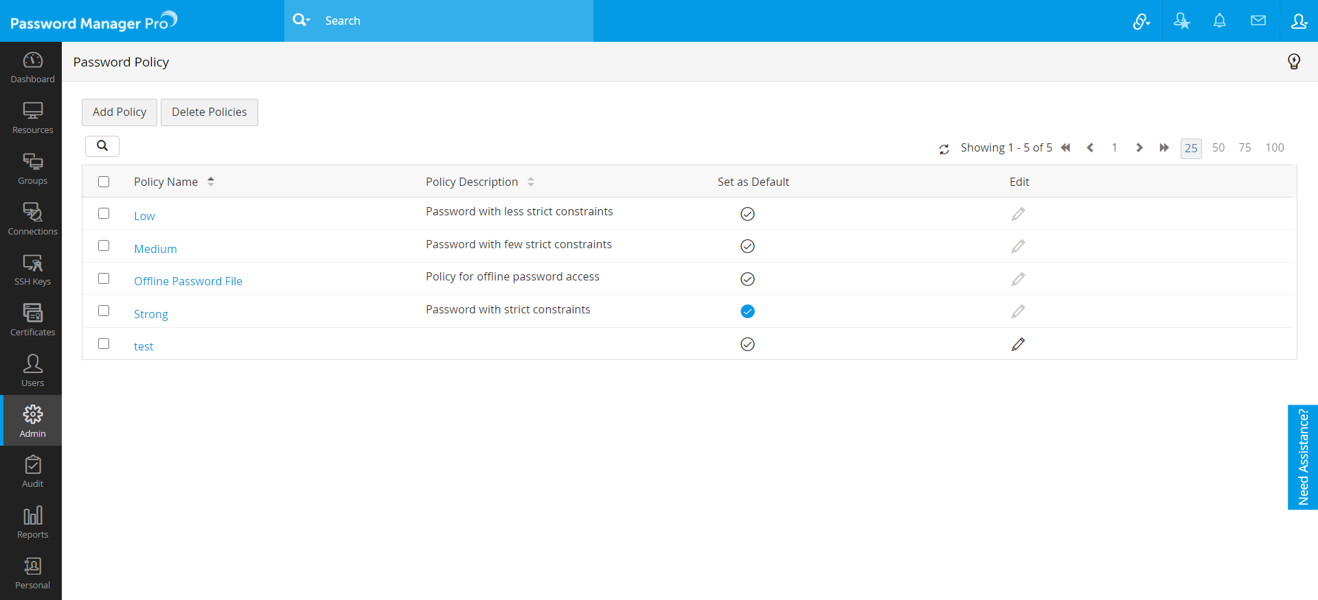 Password policy for Password Manager Pro can be centrally managed from Admin >> Resource Config >> Password policies. By default, Password Manager Pro lists four policies and these policies cannot be edited. The default password policies are: