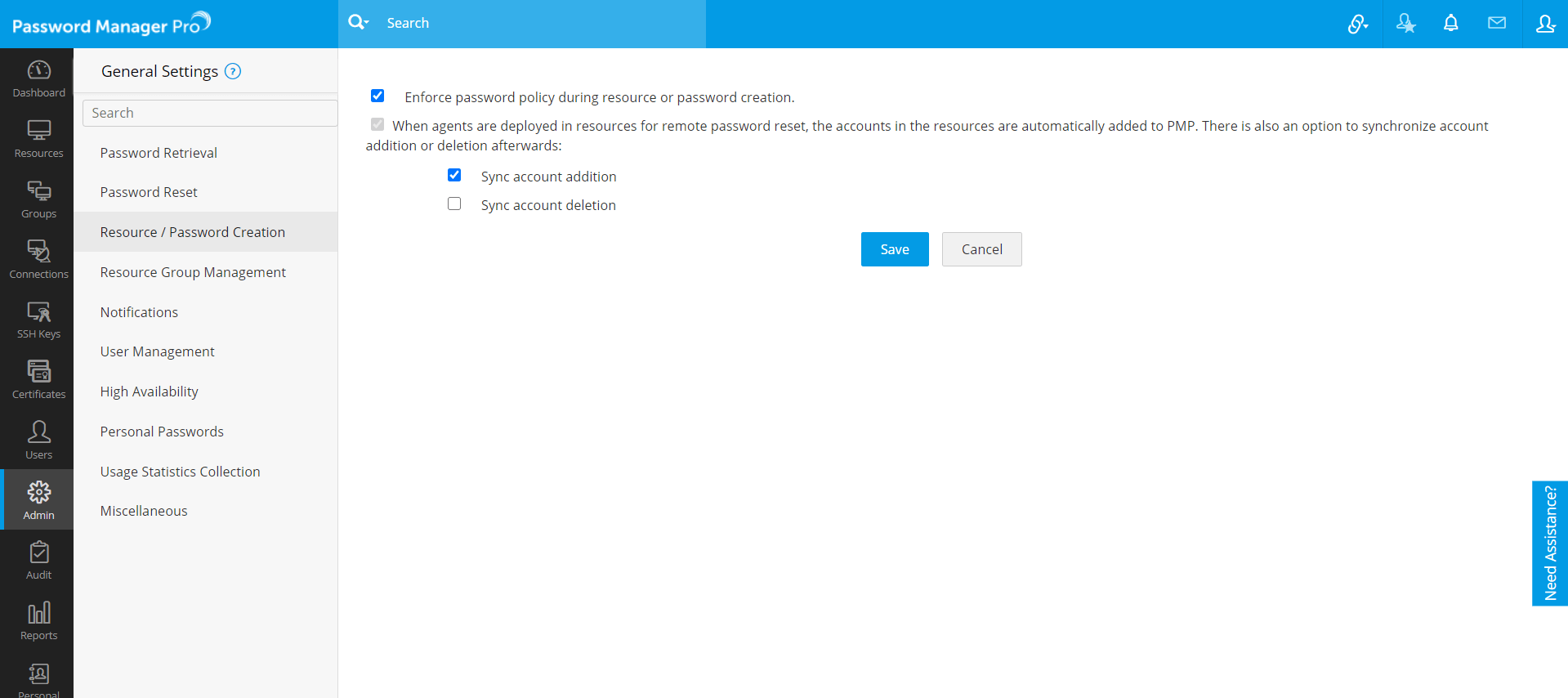 - By default password policy gets enforced only at the time of password change. If you wish to enforce policy compliance at the time of resource or account addition itself, then click the checkbox Enforce password policy during resource or password creation.
