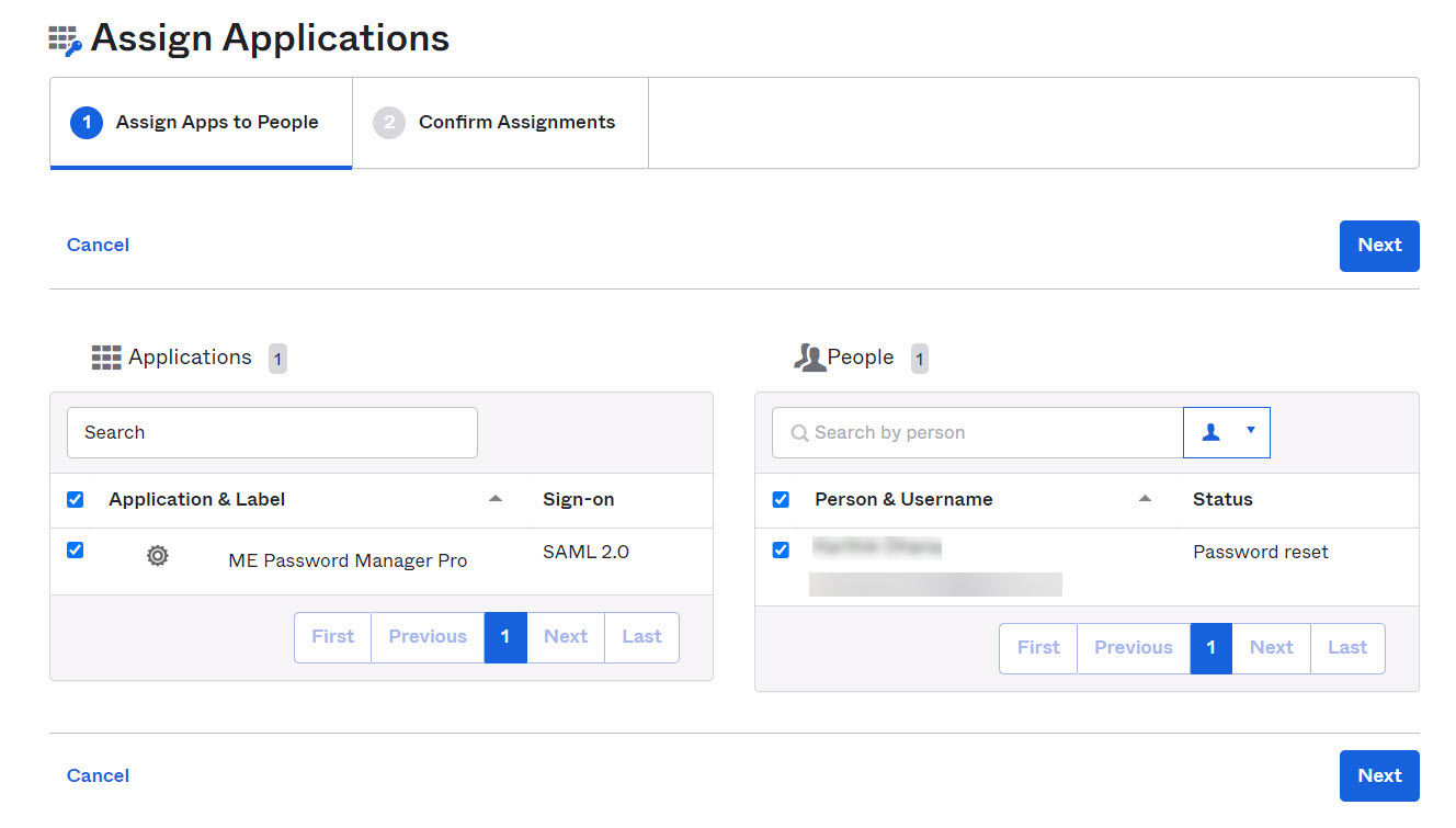 - In the Assign Apps to People tab, select ME Password Manager Pro from the Applications section and pick the desired user name from the People section.