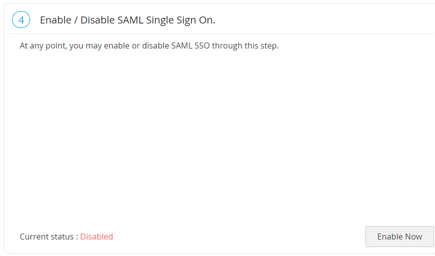 The final step of this configuration is enabling SAML Single Sign On in Password Manager Pro. This would be shown as the 4th step in the SAML page in Password Manager Pro GUI. Click Enable Now shown at the bottom right to begin using this feature.