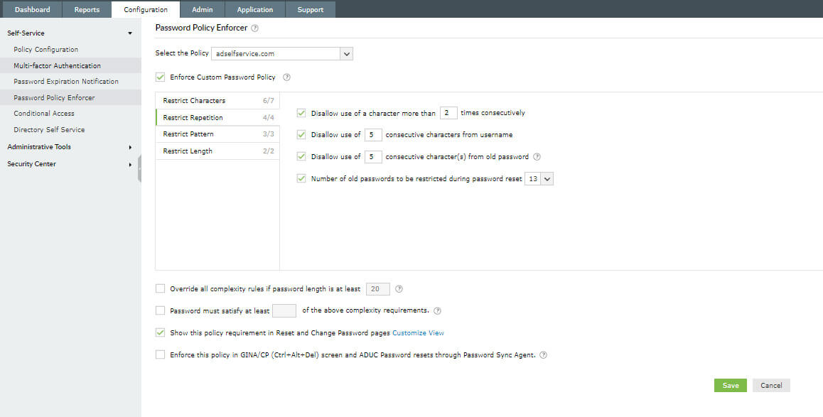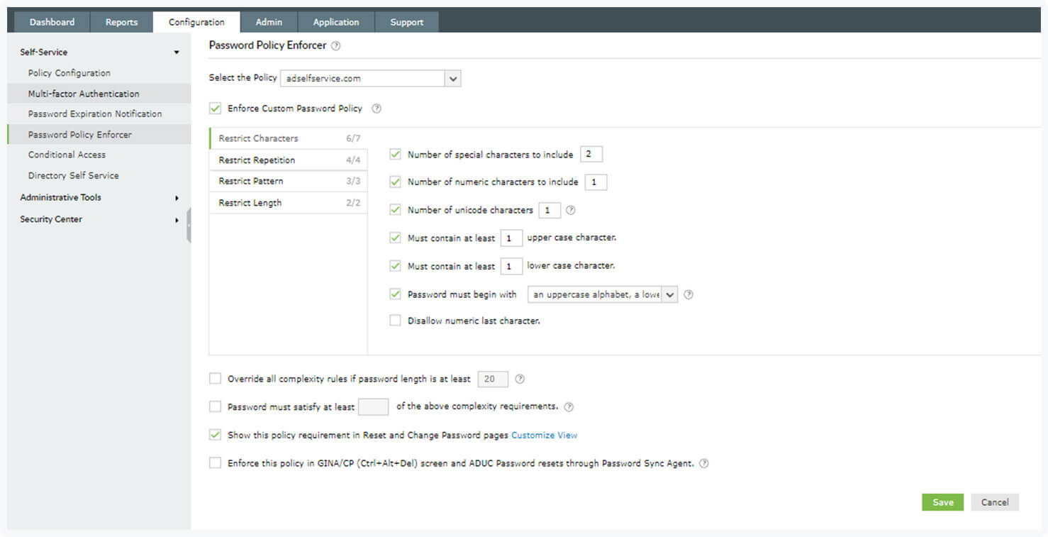 With ManageEngine ADSelfService Plus' password policy enforcer, IT admins can ensure users follow one or all of these rules when the password is set: