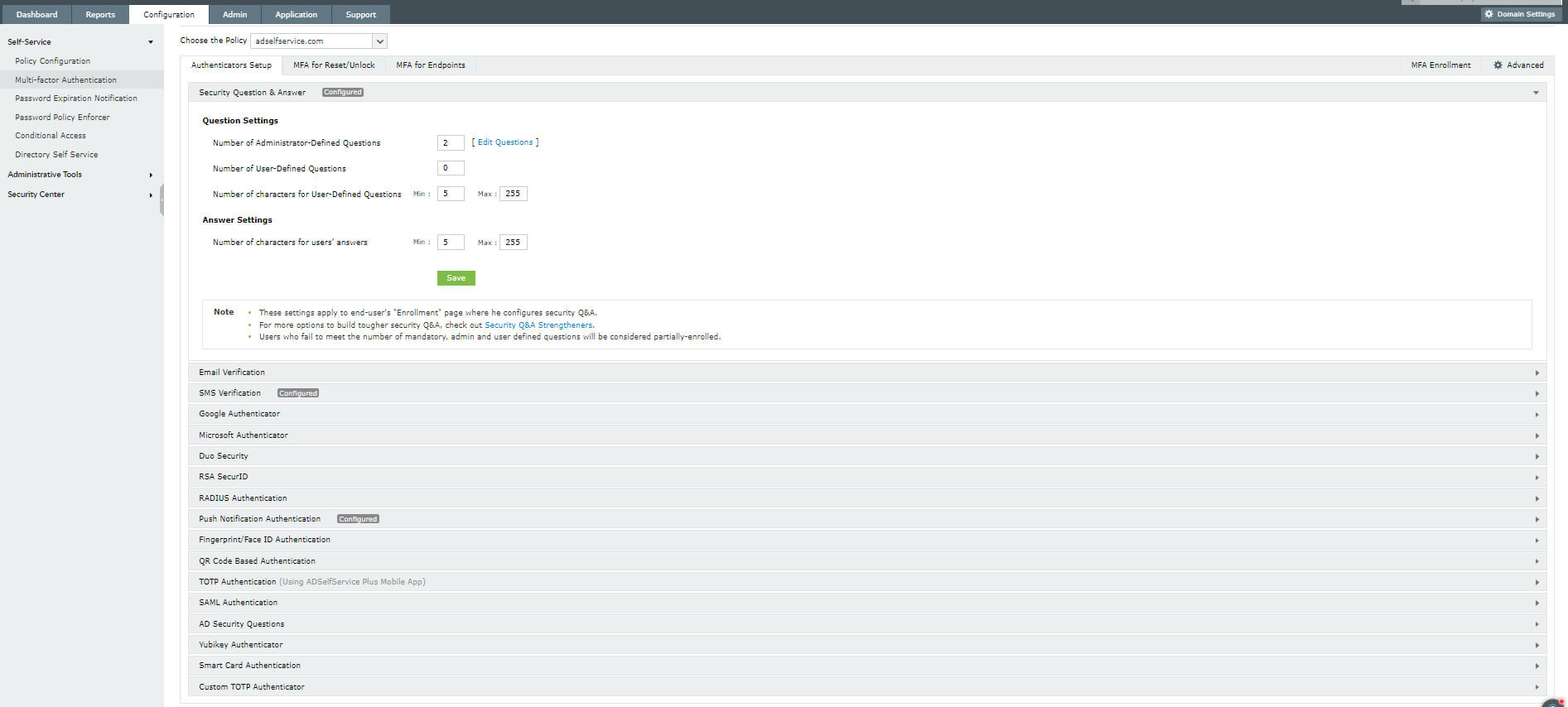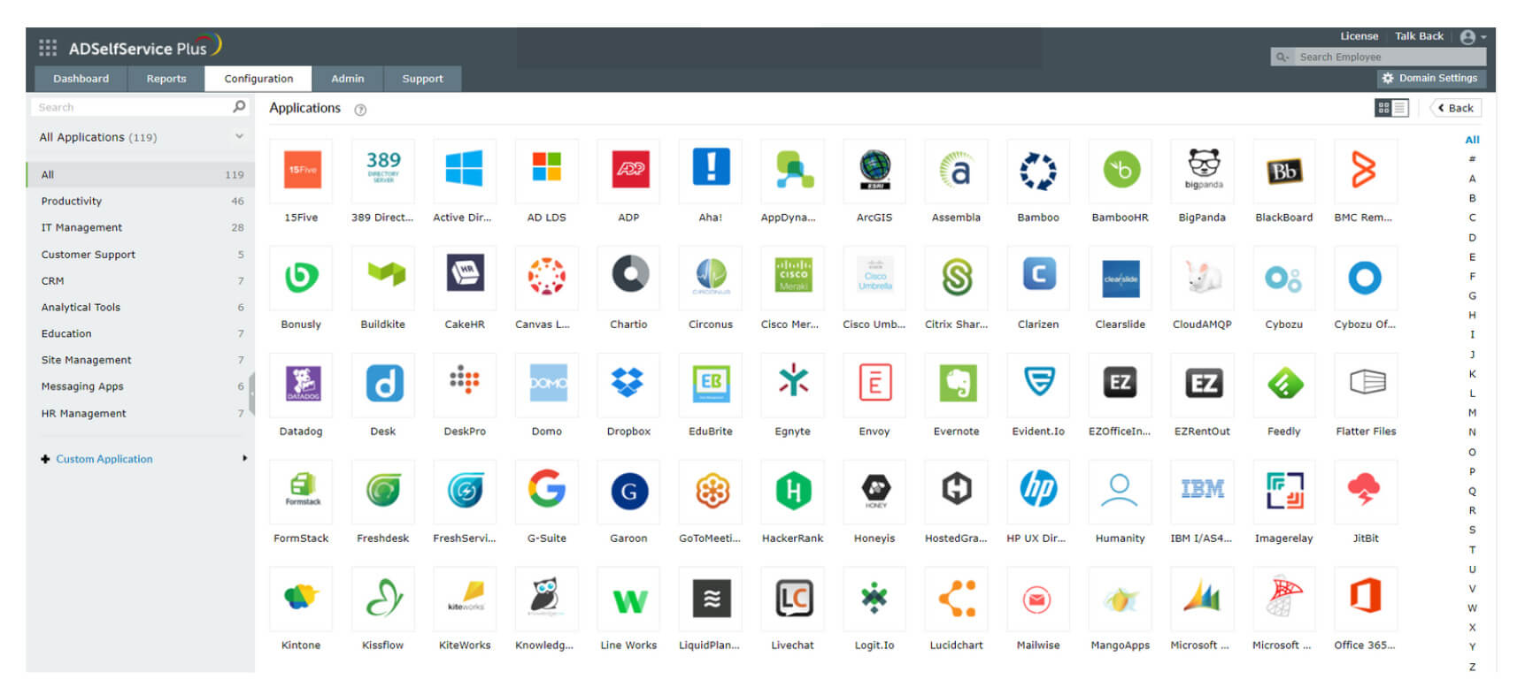 With ADSelfService Plus, you can enable SSO for over 100 pre-integrated applications and for any custom application that supports Security Assertion Markup Language (SAML)-based authentication. It also shows the user all the applications they have access to in a single dashboard. Access to applications can be secured using MFA. Additionally, IT admins can decide who has access to which applications by creating policies based on AD organizational units and groups.