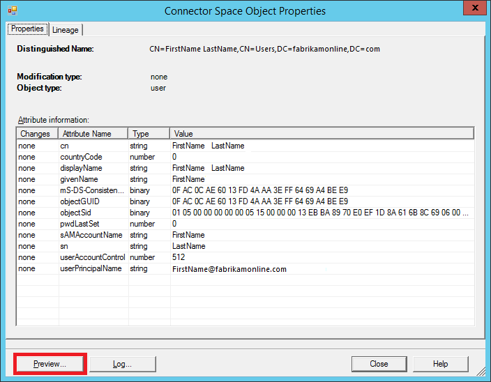 • Double-click on the Active Directory Connector to view the Connector Space attributes. Click Preview and in the dialog box that appears, click Generate Preview.