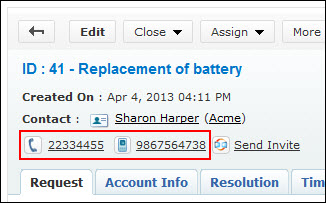 Select the mobile or phone number link to call the contact. A pop up message requesting the support rep to pick the receiver appears on establishing connection.
