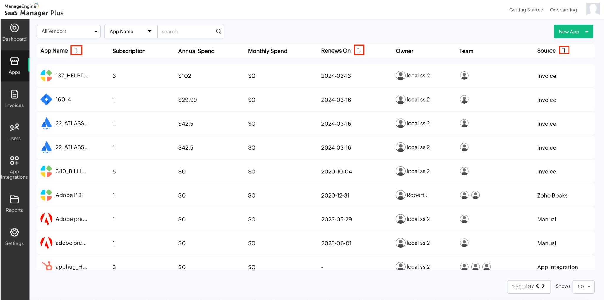 • App Name can be sorted in ascending or descending order by clicking the ↑↓ icon.